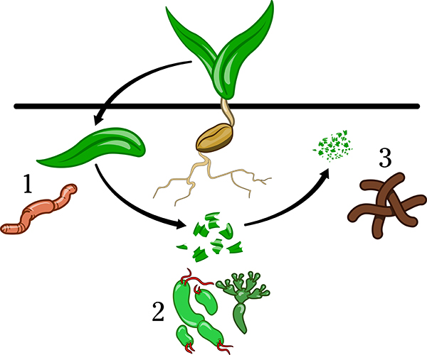 - Humus formation. The decomposition of various organic compounds proceeds through a series of intermediate products that are of an increasingly simple nature as decomposition advances. These intermediate products react with each other and with the compounds created by soil organisms. This leads to the formation of new chemical compounds that are transformed into high molecular weight, dark-coloured matter known as humic substances. These humic substances have the ability to bind positively charged ions of potassium, calcium and magnesium, for example.
